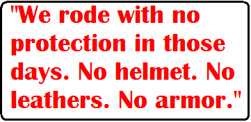 Reinaldo: We rode with no protection in those days. No helmet. No leathers. No armor. I even rode my Cabton across the air base once when I was drunk. Couldn't remember anything the next day. I was lucky to still be alive. Wouldn't ride drunk now, but especially without protection.